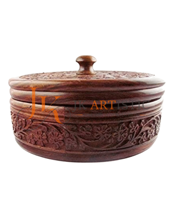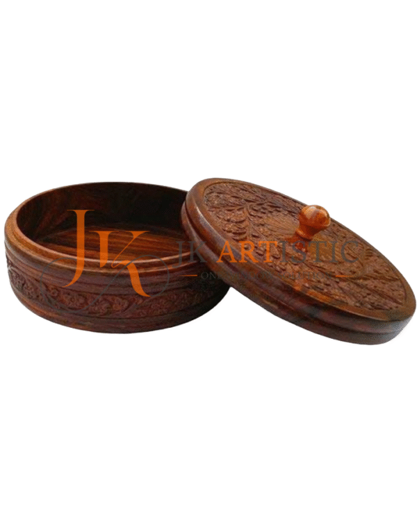 The JK Artistic Sheesham Wood Round Box blends traditional craftsmanship with versatile functionality. Hand-carved from premium Sheesham wood, it’s perfect for storing chocolates, dry fruits, sweets, jewelry, and more – making it a timeless gift for any occasion.