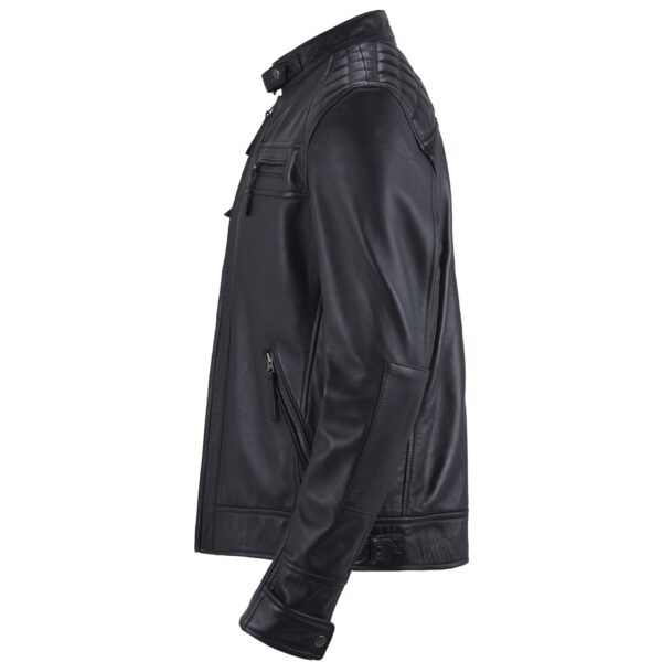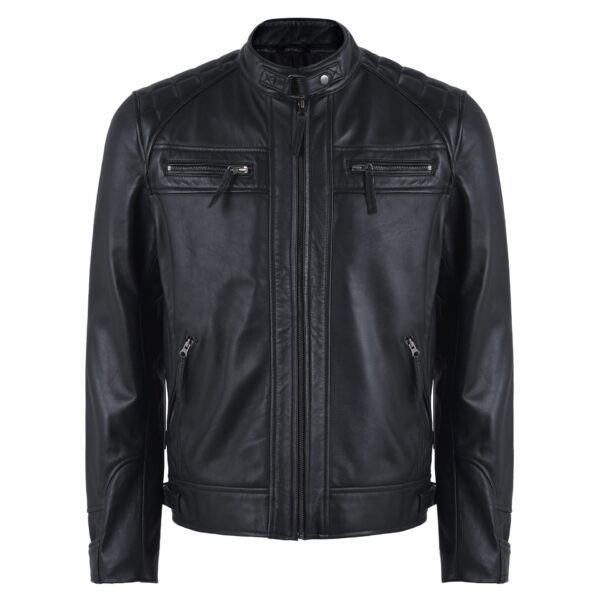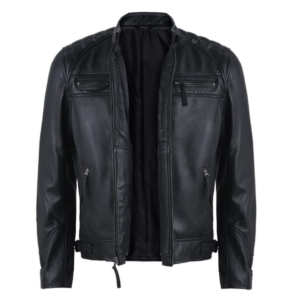 As a very classic choice, a biker leather jacket is very versatile and functional. This men’s black leather jacket mixes sleek style with built-in utility, balancing rugged durability and classic cool. The smooth leather doesn’t just look sharp; it’s tough and built to handle everything from packed commutes to late-night adventures. This motorcycle jacket’s four zippered pockets, two on the chest and two at the sides, let you keep your essentials close so you’re always ready. The zippered front closure means you’re ready in seconds, while adjustable buckles at the hem let you find your fit, no matter the layers.