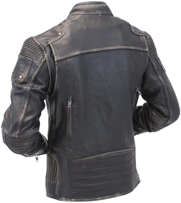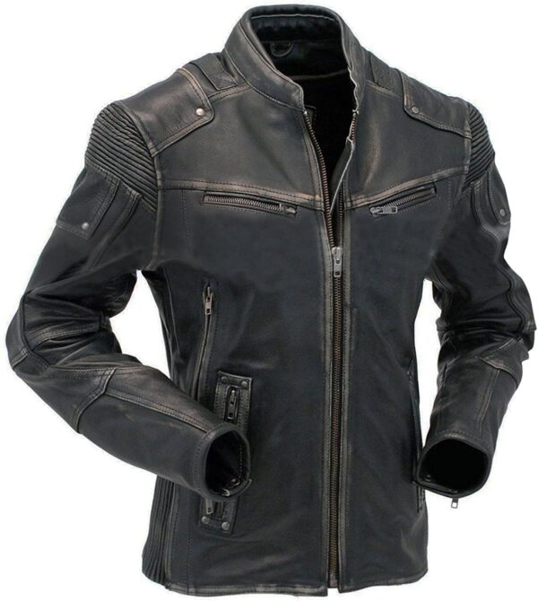 As it is distressed, this black leather jacket gives the appeal of chic racing bikers or gangster style. These kinds of jackets were worn back in the 1980s to belong to the biker culture. Its leather has been treated in a way that will make it look a little old and worn out, but that’s for style purposes. From the top two zipper pockets and two three-waist pockets to the durable construction of the paddings to the thoughtfully placed details, this real leather jacket is as much a style choice for biker folks as a functional outerwear piece. It’s made out of original sheepskin leather, which makes it really rugged and will keep you safe in case of unexpected road crashes.Â