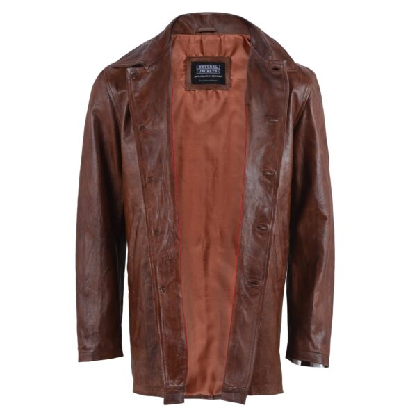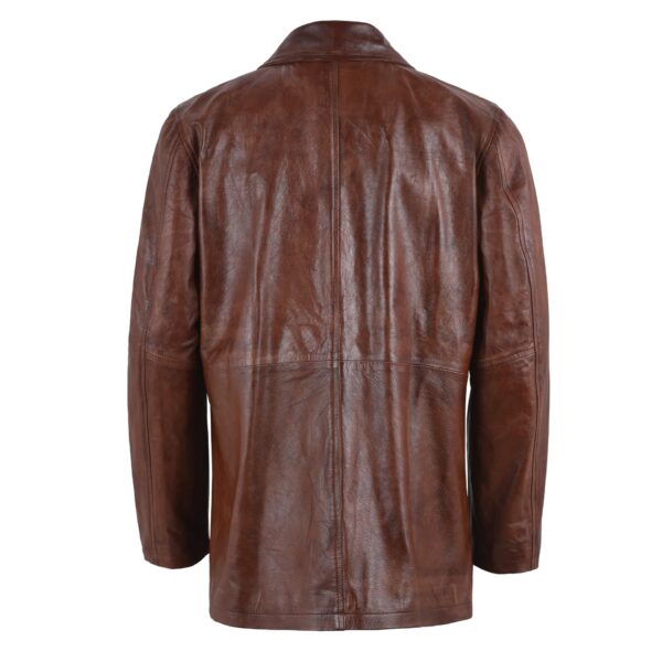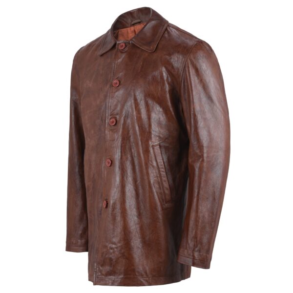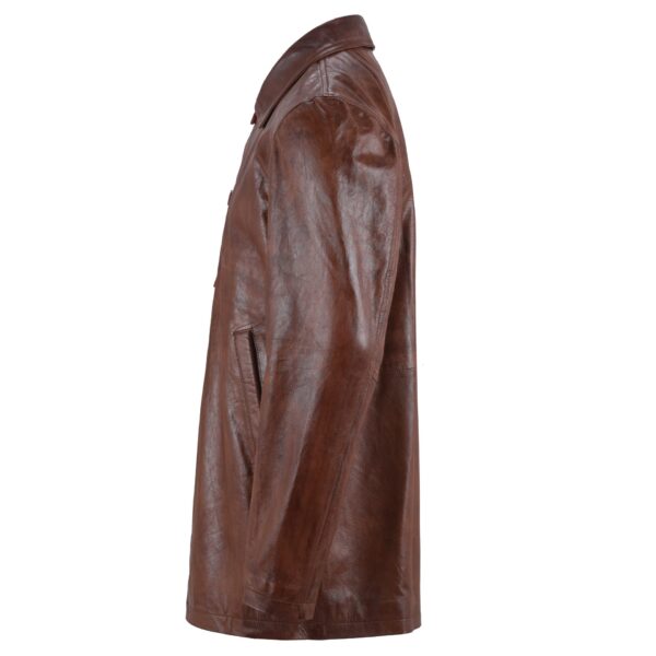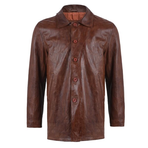 This brown leather coat replicates the design of the professional coats that men wear in professional environments. Its coat-style design has a nice brown color and a collar like a shirt, which makes it look more luxurious and sleek. The coat has long sleeves and is long enough to protect you from the weather. You can wear it with jeans for a casual look or over your work clothes. This brown coat for men has buttons down the front, making it easy to put on and take off and ideal to look like a professional.Â
