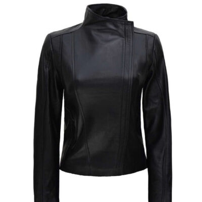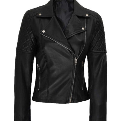 Made from premium leather, this black crystal asymmetrical leather jacket is perfect for women. Leather coats like these are incredibly adaptable and cozy. The quilted padding on the shoulders further insulates you from the wind, and the jackets as a whole are perfect for bike journeys, protecting you from weather conditions and potential mishaps. With its two outer pockets, this Crystal Womens Asymmetrical Leather Jacket in Black is quite practical for all of your everyday needs. In addition to the high-grade outer shell, the Viscose lining is also of excellent quality. Being so light, these jackets may be tossed on and off with ease.