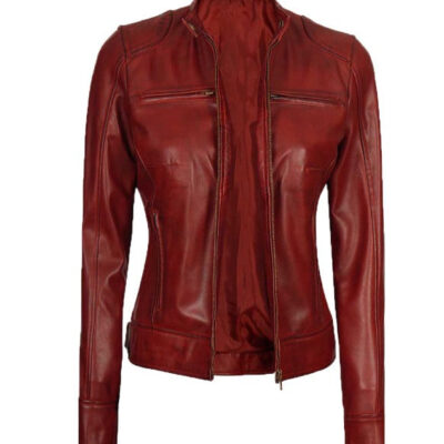 We present the classic Dodge Women’s Cafe Racer Maroon Leather Jacket, a product that seamlessly fuses fashion and utility. This biker-style leather jacket, which was made with accuracy and attention to detail, is intended to draw attention wherever you go. A slim-fit women’s jacket provides longevity in addition to refinement, making it a treasured addition to your wardrobe for many years to come. The clean lines and simple design of this zip-closure leather jacket’s cafe racer style evoke the heyday of motorcycle riding. This maroon moto jacket has a stand-up collar that gives your outfit a bit of edge and a sleek front zip fastening. Your shape is highlighted by the expertly designed fit of lambskin leather outerwear, which also promotes comfort and mobility.