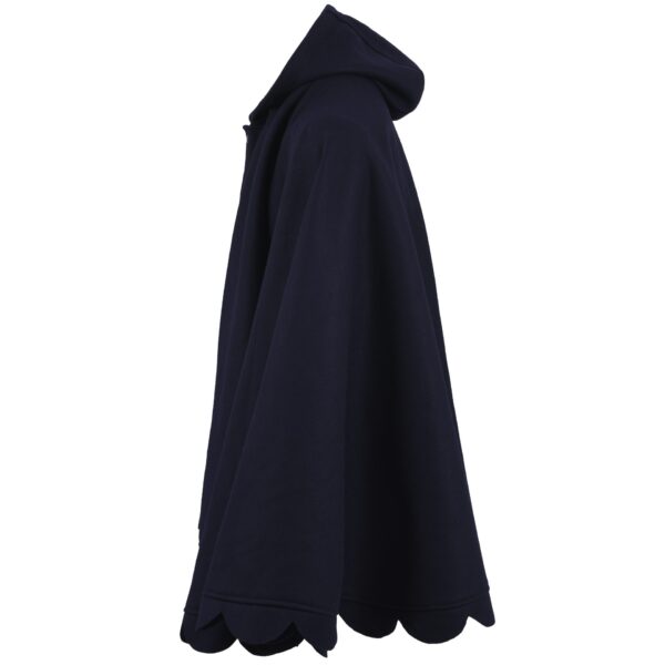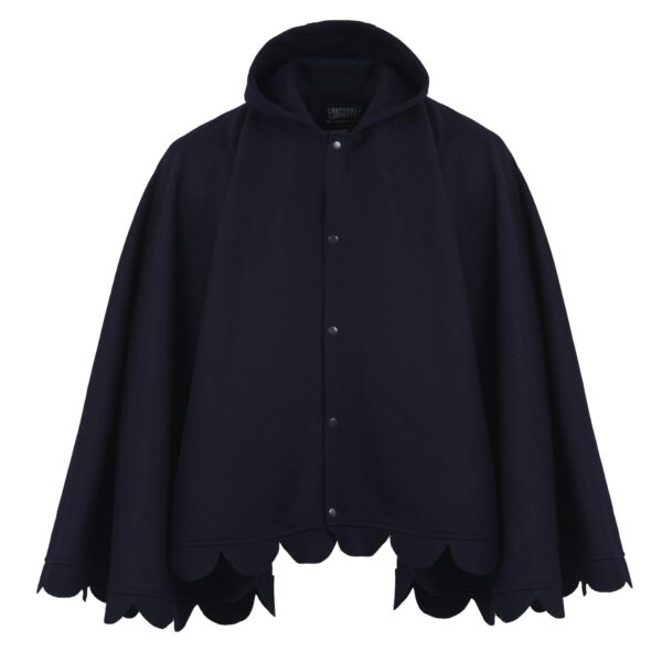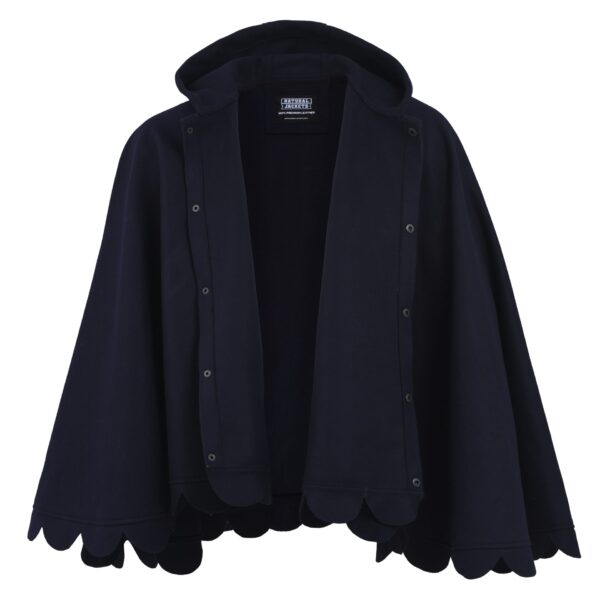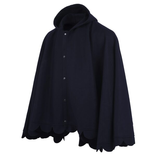 This woman poncho is in a rich navy blue color and has a button-up closure a rounded collar with a scalloped edge along the hemline that makes it unique enough and more stylish than other ponchos. The rich blue color is a striking choice which is very versatile and will add stars on every outfit you layer this navy blue color poncho with. You can use it for style as well as staying cozy in winter. Its oversized fit and unique styling give it a sense of cozy elegance and make this poncho for women ideal for layering over sweaters, sweatshirts, t-shirts, or any other outfits.